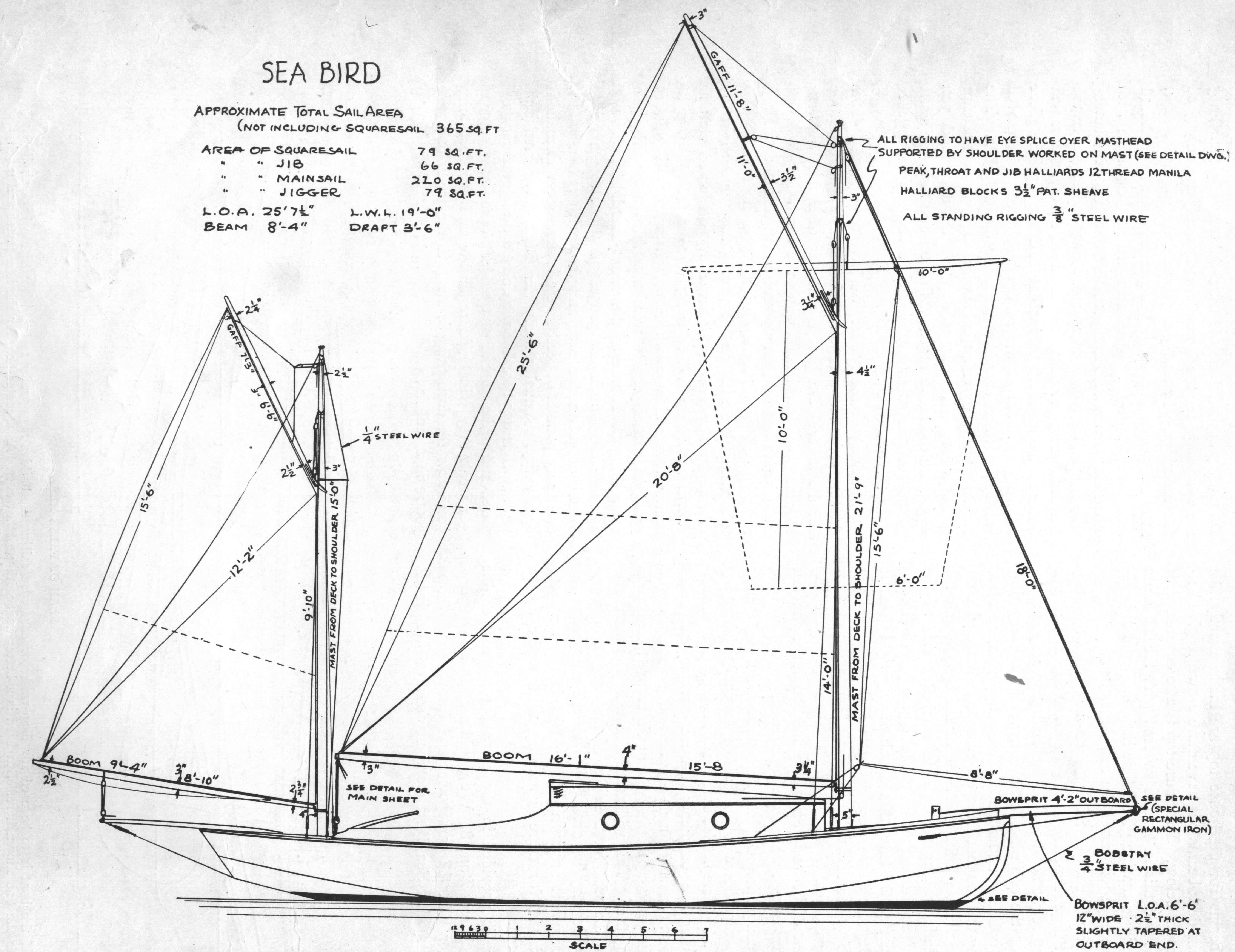 Sea Bird Yawl plans are available from WoodenBoat. The plans, redrawn in 1981 from the originals, show both the centerboard and full keel design. Irene Agnes is the full keel model, which we believe offers a wider range of cruising options in terms of both stability and space below deck. Note that WoodenBoat also sells plans for a plywood revision of the design by Charles MacGregor. Be sure to choose the Mower version for the original Sea Bird.